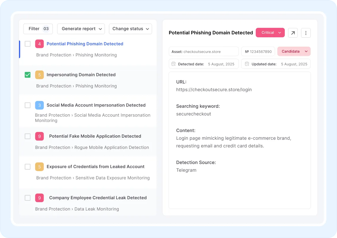 Attackers create fake websites, social media accounts, and mobile apps to impersonate trusted e-commerce brands. Cypho continuously monitors across web and app platforms, delivering context-rich alerts helping you respond to impersonation threats quickly.