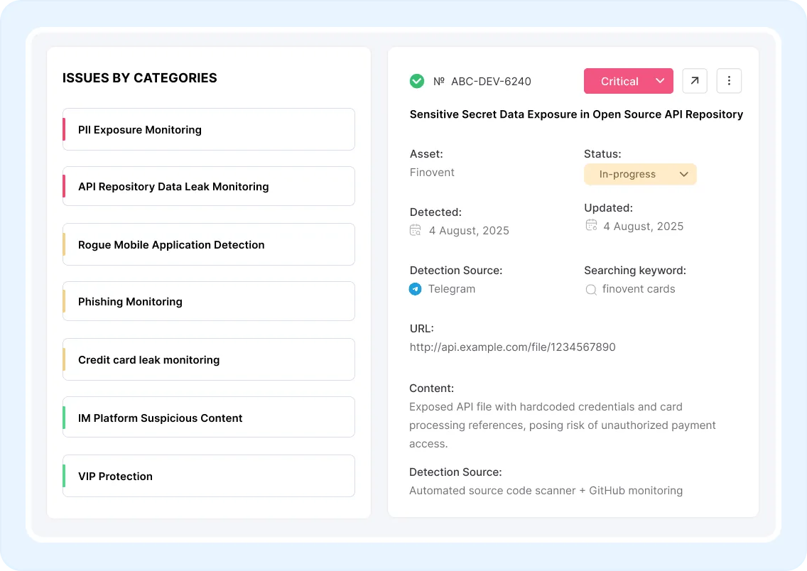 Financial institutions are the target for cybercriminals due to the sensitive nature of the data they handle. Our CTI platform delivers actionable intelligence to help financial organizations detect credential leaks, protect payment gateways, and proactively respond to data breaches across the surface, deep, and dark web.