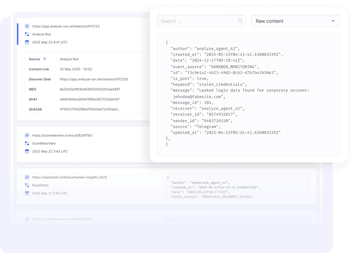Monitor platforms commonly used by attackers to publish stolen data, source code, or internal documents. Get alerted when your data surfaces.